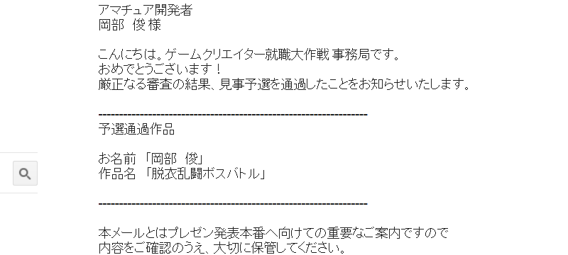 私はフロム・ソフトウェア様から第2シード、スクウェアエニックス様から第1シードを頂きました。プレゼンテーション時に大学名を発表していない為、完全に学歴関係無しで作品のみで評価してこの成果を得ることが出来ました。