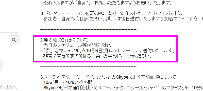 参加者用のマニュアル、パワーポイントの時間などの詳細は10月6日発表します。という文章が届きました(10月11日にプレゼン発表)