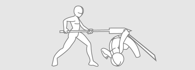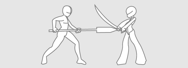まだ、状況を変えるアクションが足りていません。槍側の最適解は剣が回避するタイミングを読んで攻撃しろ、であり、剣側の最適解はタイミングよく避けろです。お互いに待ち(パッシブ)の要素が強く、状況が状況が停滞しがち = つまらない状態です