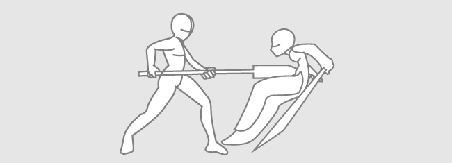 槍側の間合いに入ります。この距離では槍が一方的に攻撃できますが、剣は槍の攻撃タイミングに合わせて回避で近づくことが可能です。回避に成功すれ剣の間合いとなり、攻撃速度の速い剣が有利になります。回避に失敗すれば、剣側が吹っ飛びます。