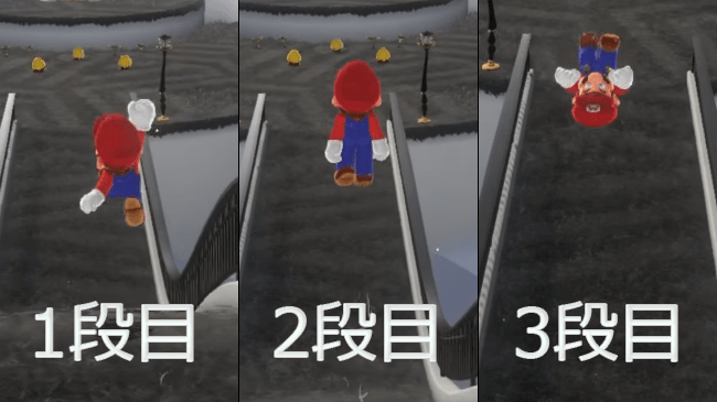 実際のマリオのジャンプの演技。着地ごとにテンポよくジャンプボタンを押すことで3段階のレベルで高く飛ぶことが出来ます。